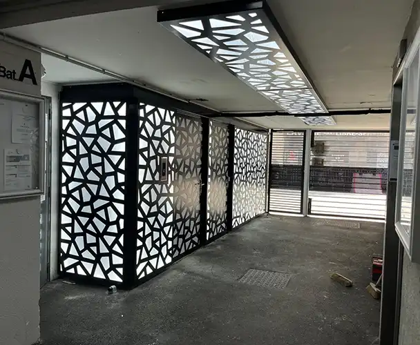 Après validation du dessin, les éléments ont été fabriqués sur nos machines de découpe laser puis pliés avec précision pour un rendu visuel haut de gamme et parfaitement ajusté.